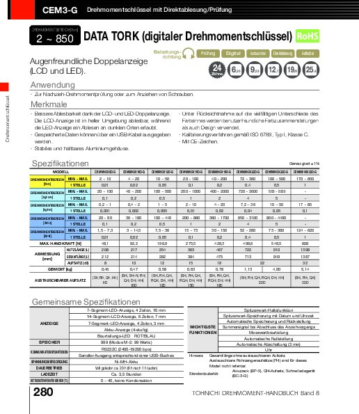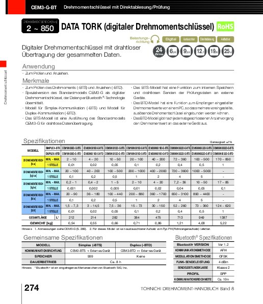 - BTS-Modell: Eigentlich eine Variante des CEM3-G mit drahtloser Datenübertragung. Bietet die Funktion, die geprüften Daten im Werkzeug zu speichern und drahtlos an ein externes Gerät zu senden.