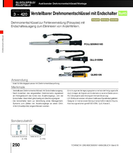 Verstellbarer Klick-Drehmomentschlüssel mit Grenzwertschalterausgang und Spiralkabel. Bei Erreichen des eingestellten Drehmoments (Klickpunkt) übermittelt der integrierte Grenzwertschalter zeitgleich ein Kontaktsignal. Das Signal des Grenzwertschalters wird von einer Speicherprogrammierbaren Steuerung (SPS, PLC) oder einem ähnlichen Gerät erfasst, um mit Hilfe von Blockiersteuerungen in der Montagelinie ein System zur Sicherung des Schraubprozesses einzurichten.