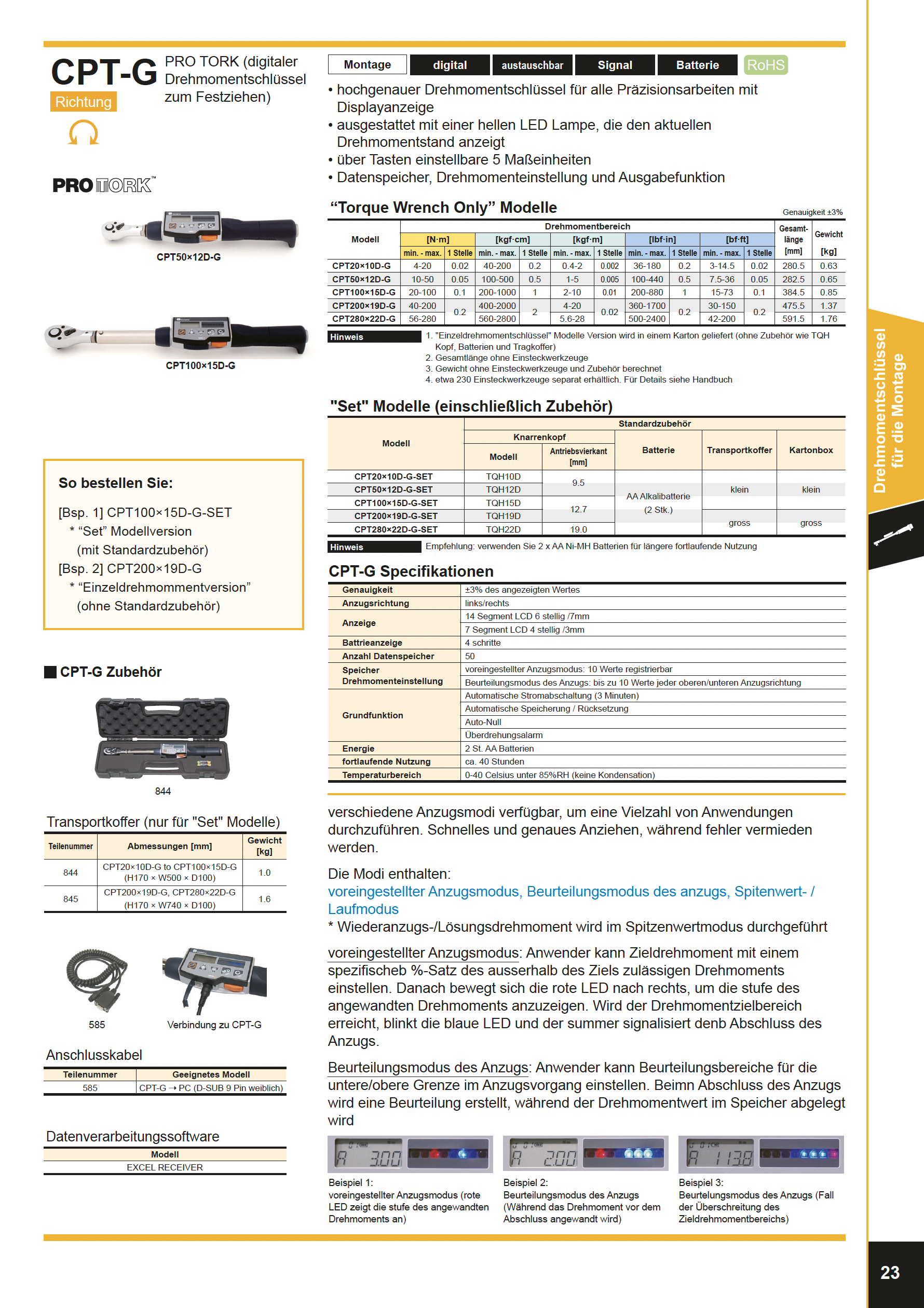 Die Einstiegsmodelle der Serie CPT-G sind für Anzugsanwendungen sowohl in Rechts- als auch in Linksdrehrichtung konzipiert. LED-Leuchten ermöglichen eine einfache Verfolgung des Anzugszustands, während er sich dem Zielanzugsmoment nähert. Gespeicherte Daten können über ein PC-Kabel (separat erhältlich) ausgegeben werden.