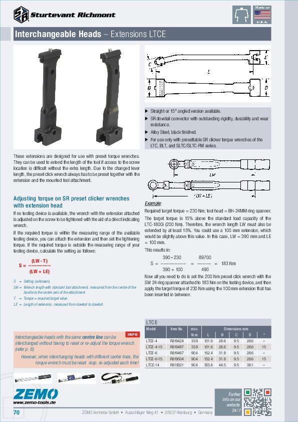These extensions are designed for use with series LTC preset torque wrenches. They can be used to extend the length of the tool when access to the fastener is difficult without the extra length. The preset torque wrench must always be preset after the extension and the fastener engagement interchangeable head have been attached.