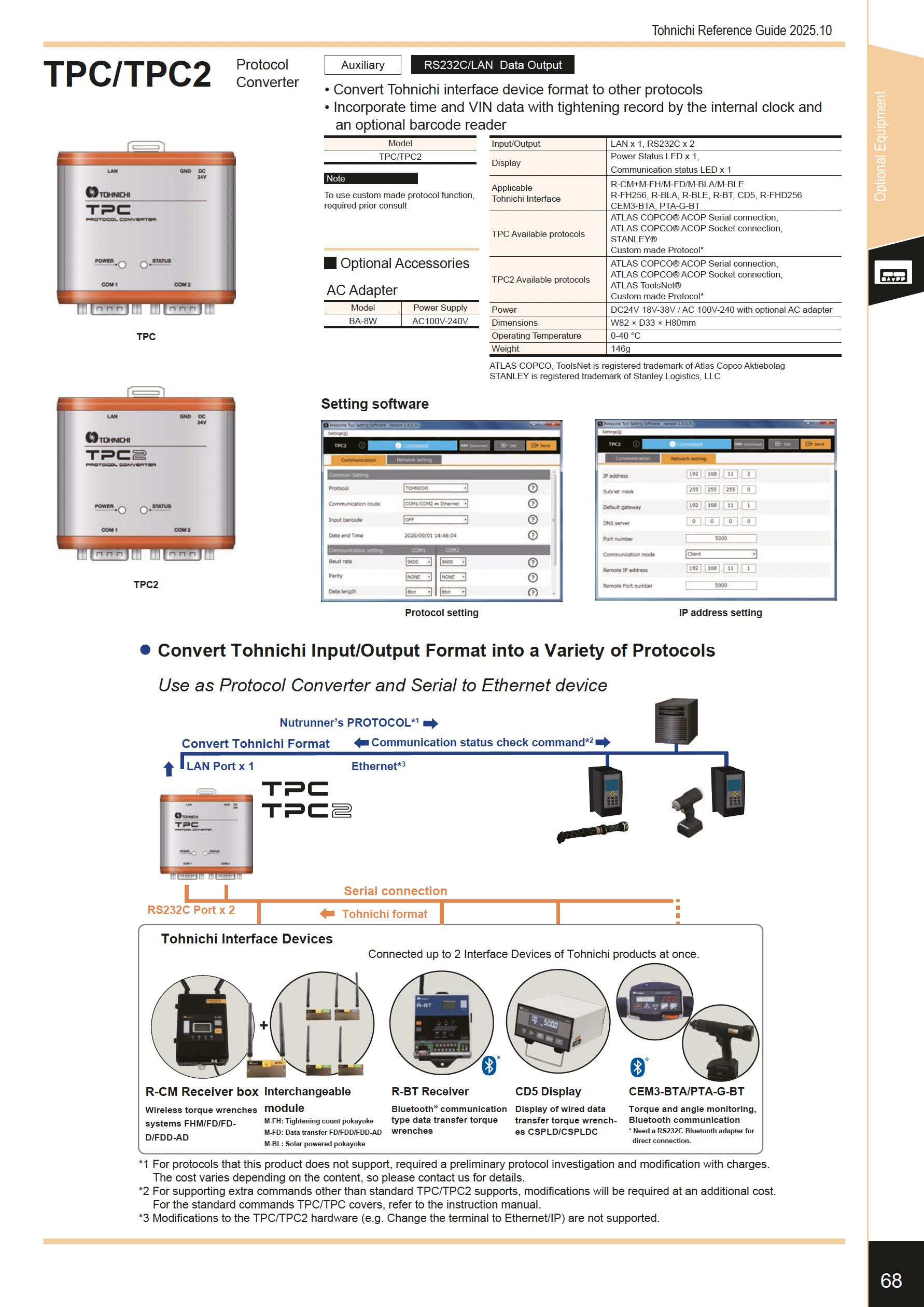 Convert Tohnichi output format to a wide variety of protocols in your network. You can select from four protocols, including Atlas Copco Open Protocol. TPC model: ACOP serial / ACOP socket / Stanley / Custom; TPC2 model: ACOP serial / ACOP socket / ToolsNet / Custom. Pls contact us for details.
